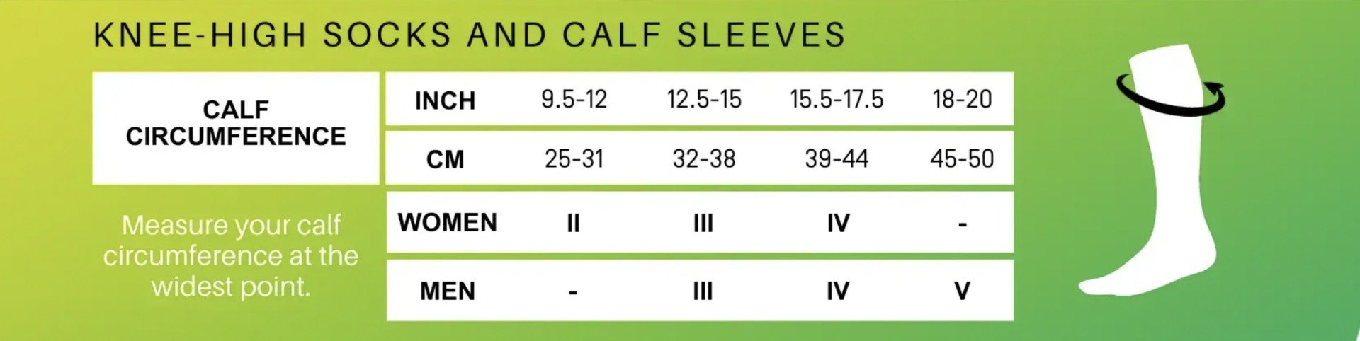 De juiste maat kiezen is belangrijk voor de werking van de kousen. De maat is te bepalen aan de hand van de maattabel.