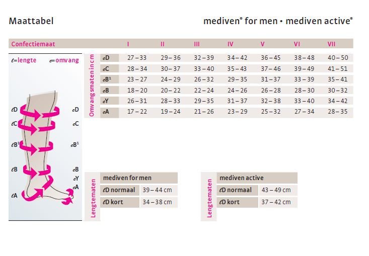De Mediven Active lijn is beschikbaar in twee drukklassen, CCL1 & CCL2. Voor CCL3 (drukklasse 3) kousen raden wij de Mediven Forte of Mediven Plus aan.