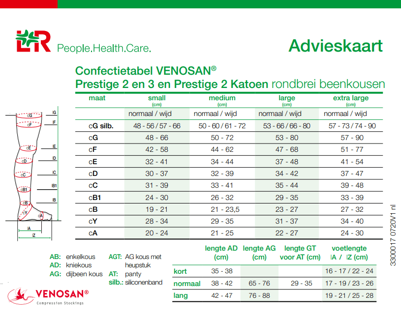 De juiste maat kiezen is belangrijk voor de werking van de kousen. De maat is te bepalen aan de hand van de maattabel.